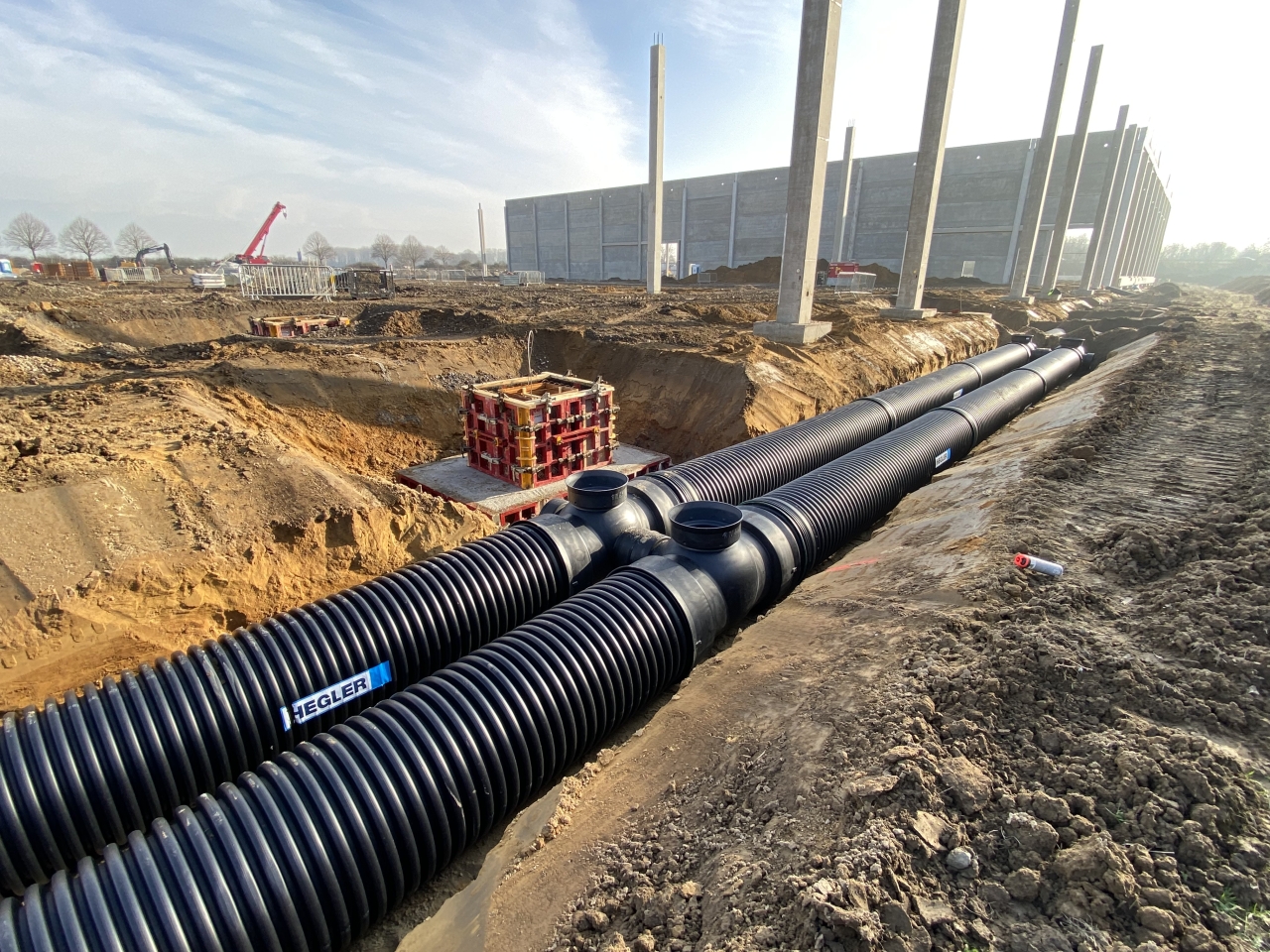 Together with the proved HEGLER fittings and MULTI-inspect chamber systems individual laying arrangements can be achieved with the largest possible retention volume on the basis of the available space. Thanks to the low weight of AQUATUB-Rw twin wall pipes fast and thus low-cost installation as well as reliable stability for use in SLW 60 classified roads is guaranteed. For optimised installation arrangements, project-specific structural analyses, or any other technical advice on the design, our specialist consultants may be contacted at any time during the planning phase.